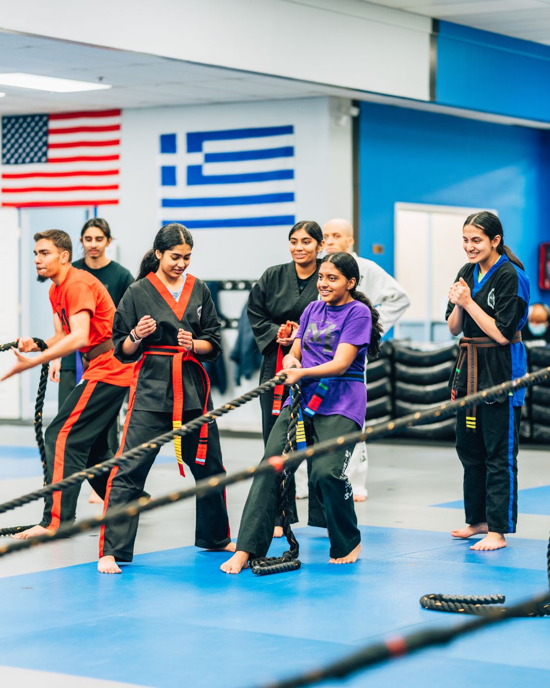 A group of Teen/Adult MMA students stand around a classmate on the battle ropes, cheering her on through a strenuous workout.