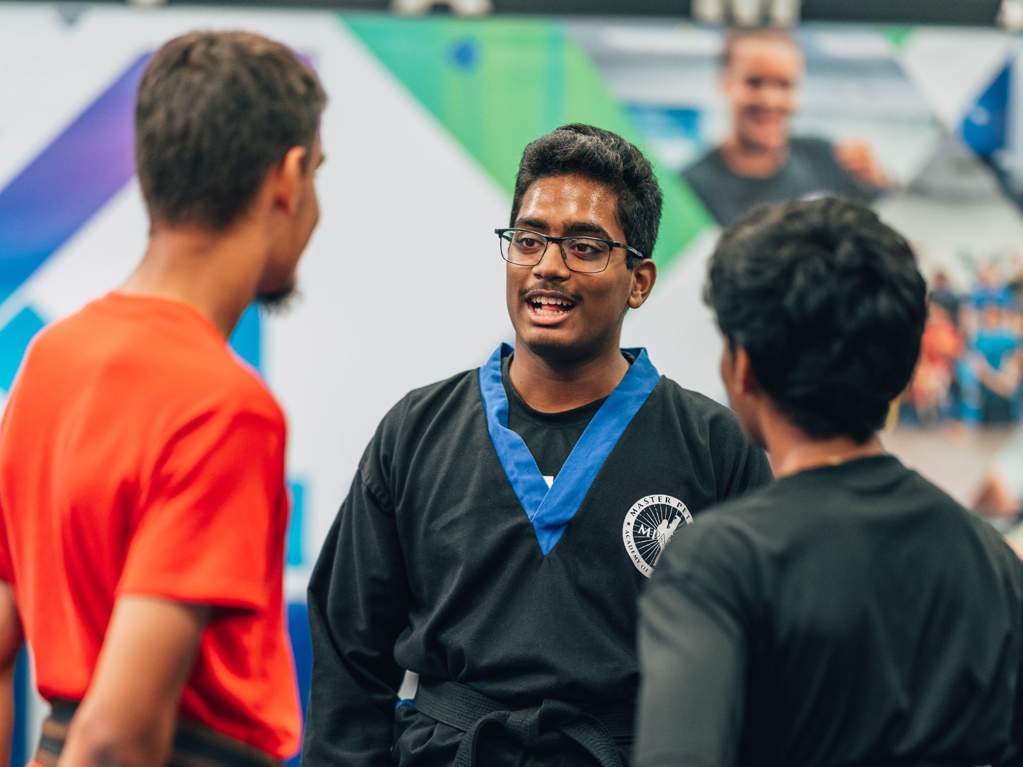 3 Teen/Adult students chatting about how to help each other improve during their drill.