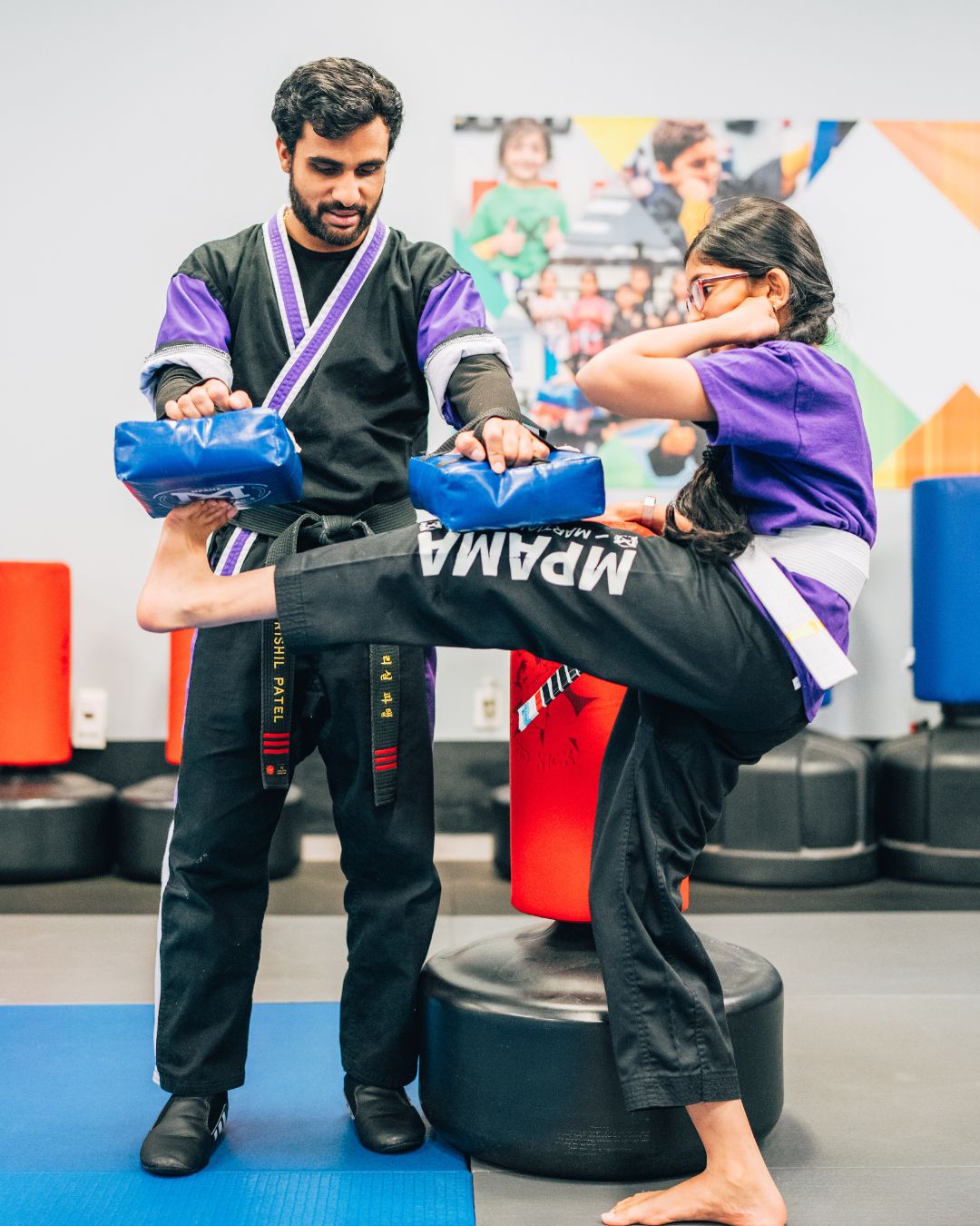 A White Belt student practices making her kicks higher with an instructor.