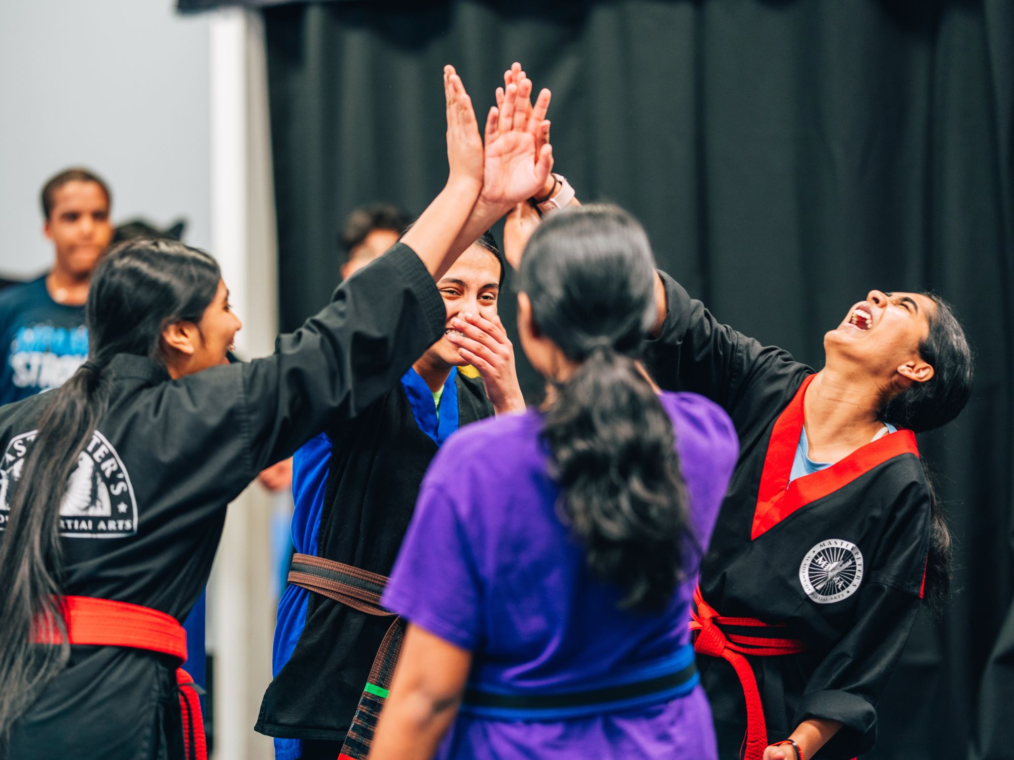 A group of Teen/Adult MMA students celebrate with a group high-five after winning a competition in class.