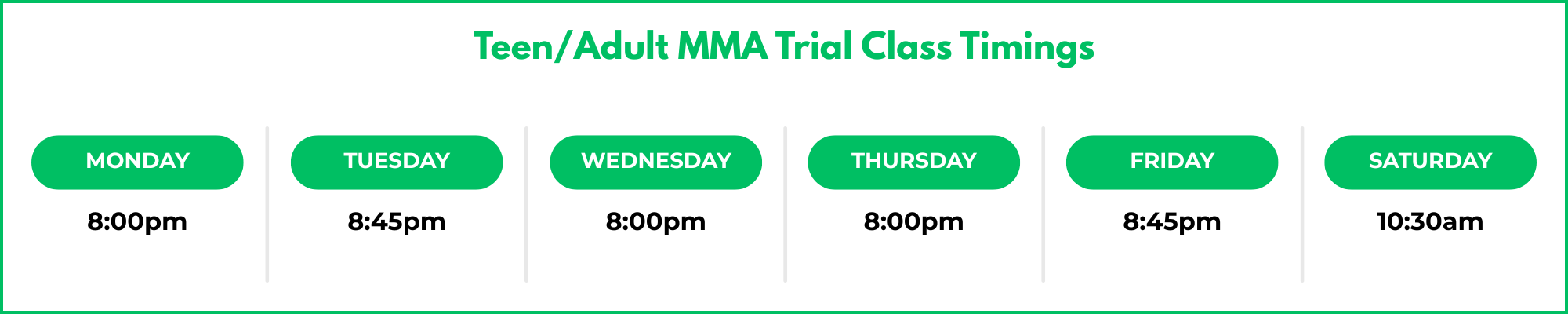 See our class timings below for our Teen/Adult MMA Program!